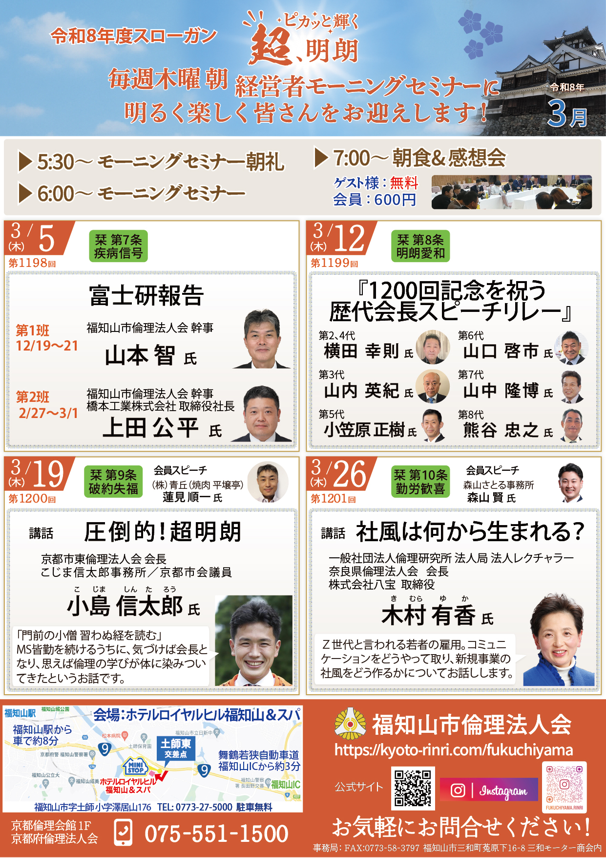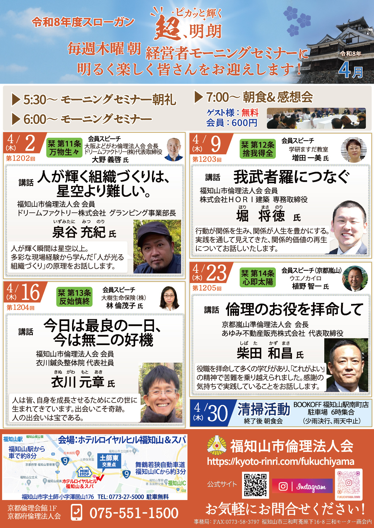 今期の福知山市倫理法人会スローガン、「ピカッと輝く超明朗」の元、何事も明朗に取り組んでいきたいと思います。